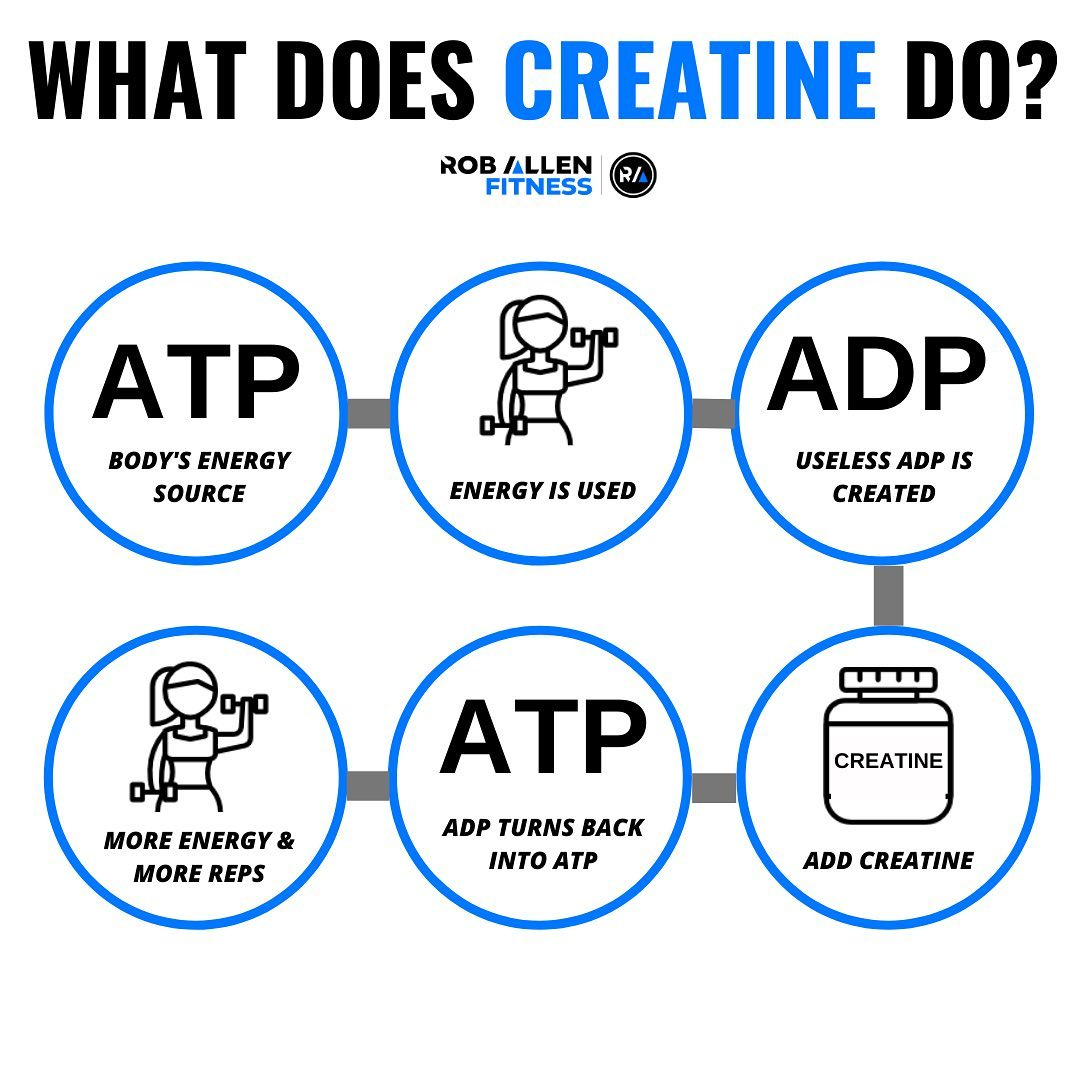 Creatinefosfaat kan ADP omzetten in ATP waardoor er weer energie beschikbaar komt. Hierna wordt de voorraad creatinefosfaat weer op niveau gebracht als volgt: